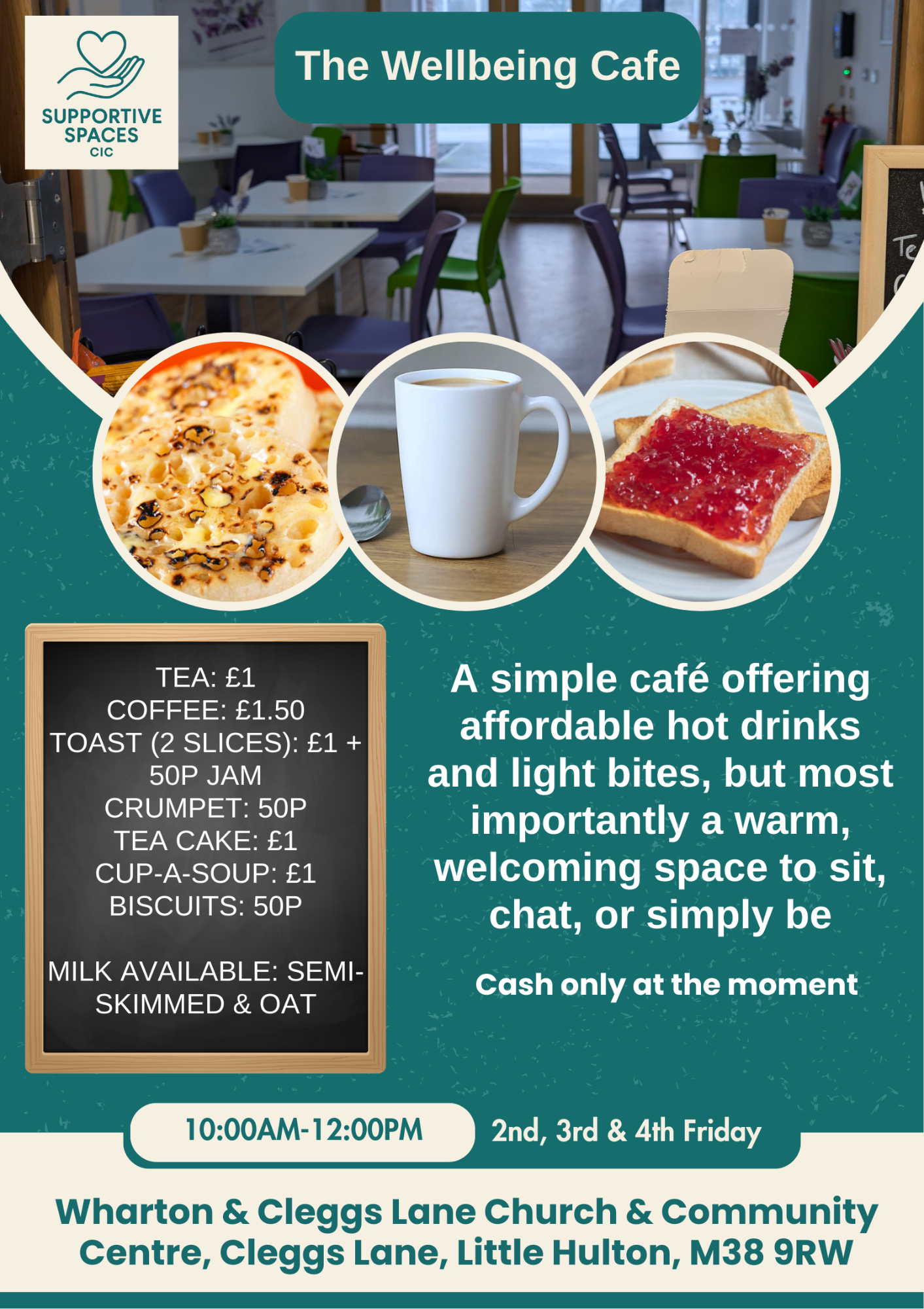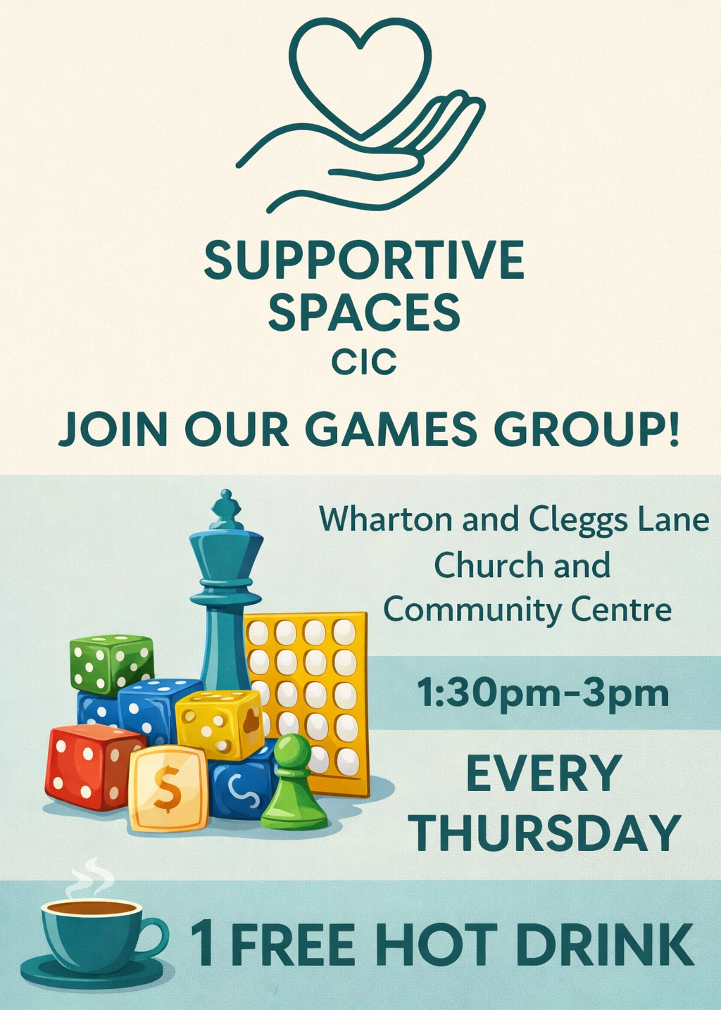 Every 2nd, 3rd and 4th Friday of the month 10:00-12:00 at Wharton and Cleggs Lane Church. Offering affordable "no frills" hot drinks and light snacks, with games and activities availble